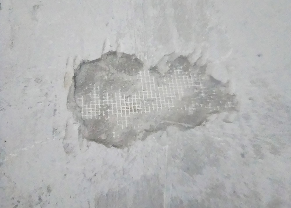 此種情況多是由于網(wǎng)格布鋪貼不平整、未壓實導致。粘貼網(wǎng)格布時,先要滿批輕質抹灰石膏,刮平后,在輕質抹灰石膏初凝具有一定強度后,將網(wǎng)格布鋪貼平順,壓入抹灰層中,使網(wǎng)格布位于輕質抹灰石膏外表面三分之一處。網(wǎng)格布一定要滿粘施工,嚴禁薄貼或打點粘貼。