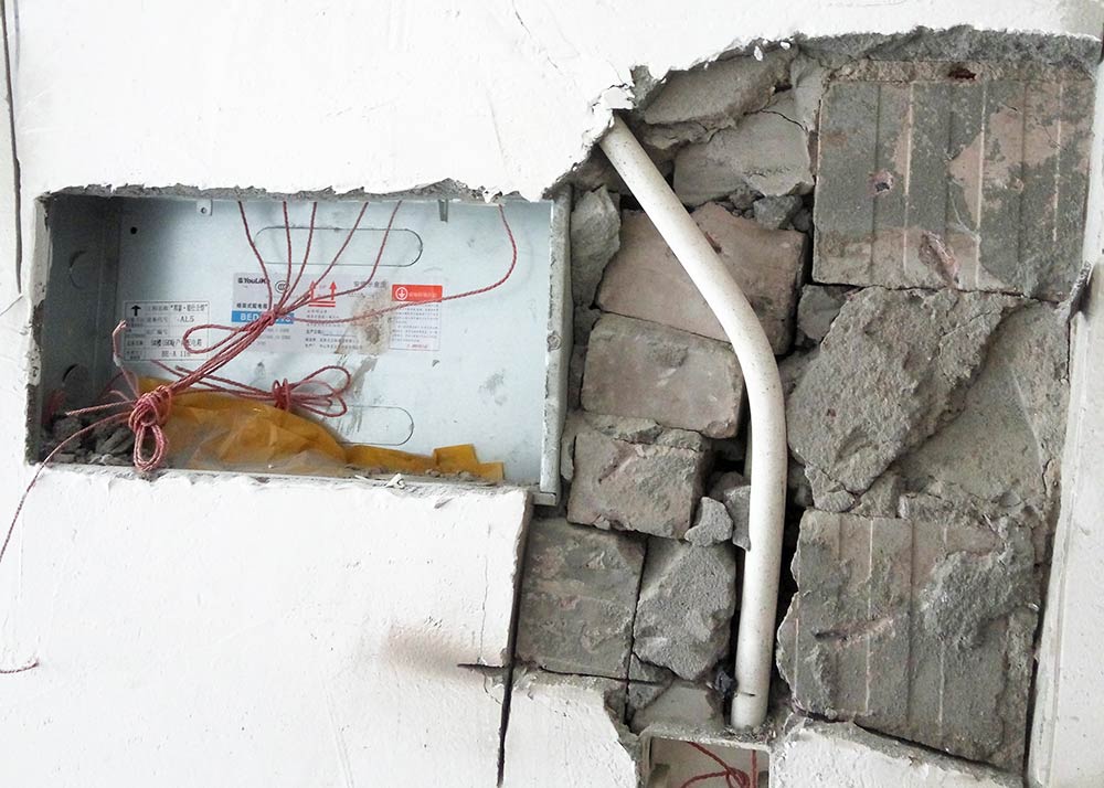 主要是由于管線、線槽等位置未填實導致的。在預埋管線、線槽等位置,使用砂漿進行回填時,應填充密實,并保證漿齡期28天以上,最好使用輕質抹灰石膏進行線槽、孔洞的修補,以降低收縮,保證抹灰層的質量。
