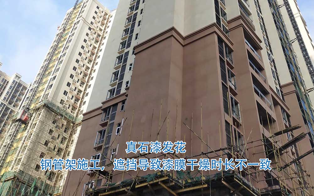 由施工引起的真石漆發(fā)花,比較常見的就是加水比例不一致、噴涂厚薄不均等。