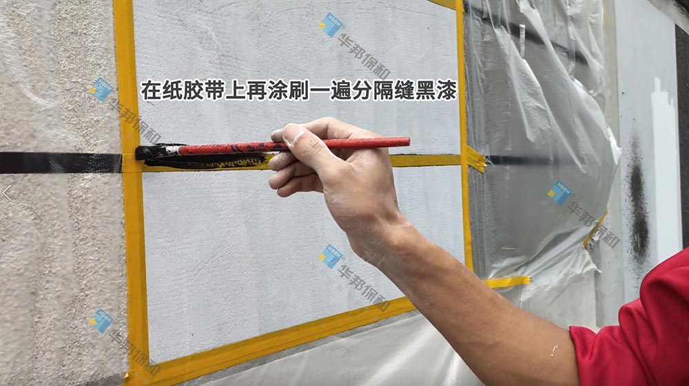出現(xiàn)這種情況,需要返工重做。首先撕掉紙膠帶,重新涂刷分隔縫黑漆,分隔縫寬度要與紙膠帶寬度相當(dāng)。之后粘貼紙膠帶,再使用黑漆在紙膠帶上涂刷一遍,其目的是靠分格縫漆自然干透后成膜的原理,封閉紙膠帶與分格縫之間的空隙,達(dá)到不滲邊的目的。等漆膜干燥后,重新噴涂同色底漆。這里需要注意,水包砂同色底漆加水比例不能超過10%。干燥后噴涂水包砂,一次噴涂不宜過厚,建議噴涂兩遍,不易流掛,施工后的效果也很好。