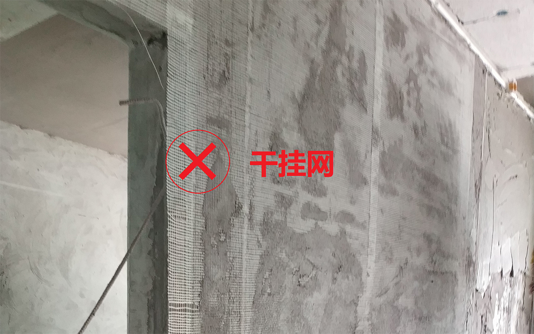 1、下圖掛網(wǎng)粘貼隨意且厚薄不均,只是在形式上完成了掛網(wǎng)施工的工序,但由于粘結(jié)不牢,很容易引起墻面空鼓。
