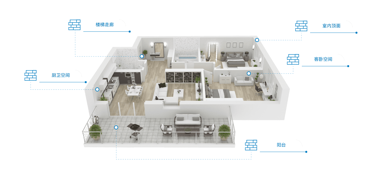 華邦保和從室內(nèi)生活場(chǎng)景出發(fā),為不同區(qū)域空間(客臥空間、廚衛(wèi)空間、頂面、陽(yáng)臺(tái)、樓梯走廊)提供專業(yè)的解決方案,筑建人居安全環(huán)保美好生活。